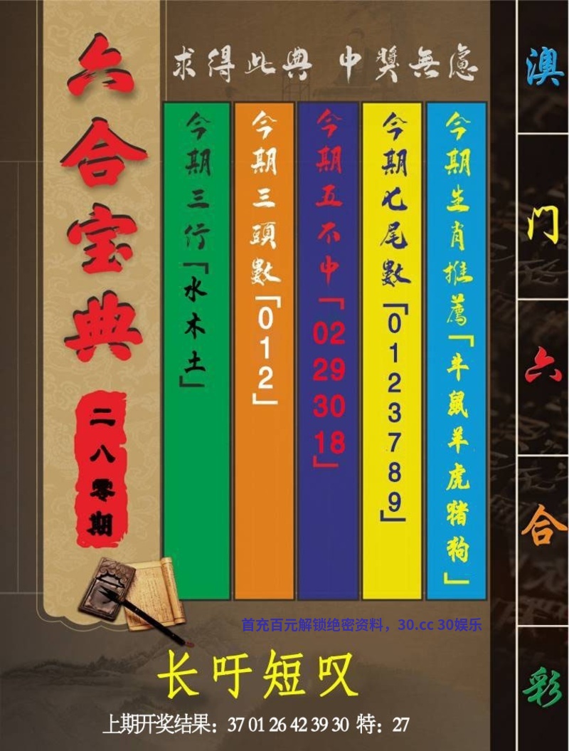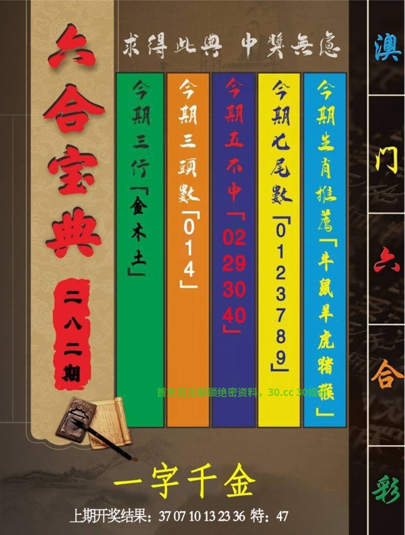 282期六合宝典《一字千金》 ①图解特肖:鼠羊猴虎猪牛 ②七尾中特:0823179 ③四码不中:02.29.30.40 |